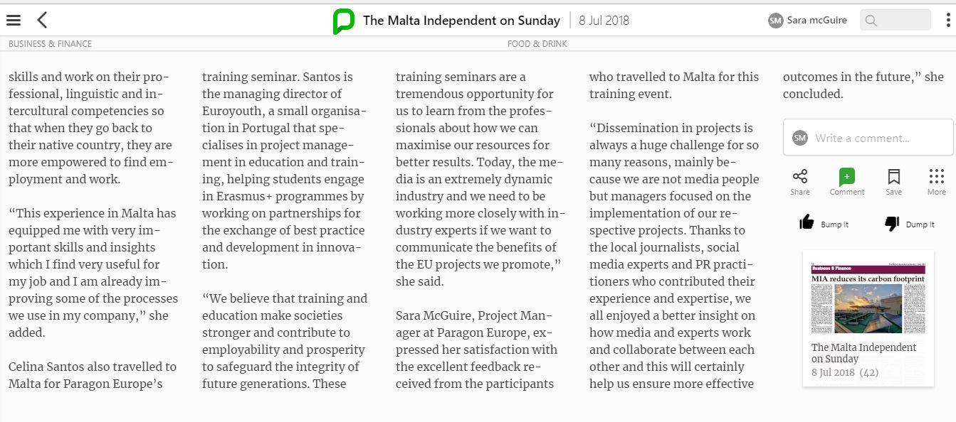Sara McGuire, Project manager di Paragon Europe, ha espresso soddisfazione per l’eccellente feedback ricevuto dai partecipanti che si sono recati a Malta per questa settimana di formazione. “La disseminazione nei progetti è sempre una grande sfida per tanti motivi, principalmente perché non siamo operatori media ma manager focalizzati sull’implementazione dei nostri rispettivi progetti, grazie ai giornalisti locali, ai social media e ai promotori delle PR che hanno contribuito con la loro esperienza, abbiamo goduto di una migliore visione su come i media e gli esperti lavorano e collaborano tra loro e questo sicuramente ci aiuterà a garantire risultati più efficaci nel futuro”, ha concluso McGuire.